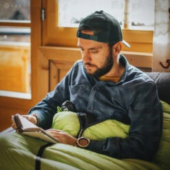 Le AR 600/800 d’Aura est un sac de couchage garni de 600 grammes de duvet d’oie polonais de qualité, de 800 cuin. Le duvet est réparti dans des compartiments en forme de H afin de limiter les déperditions thermiques. Il ne dispose pas d’une forme momie classique, mais d’une forme en trapèze. Grâce à cela et à sa coupe standard, il offre un bon rapport entre le poids et la température de confort. Sa fermeture éclair sur le devant permet une plus grande liberté de mouvement, pour manger tout en restant au chaud par exemple.