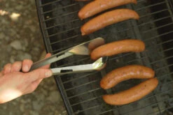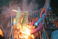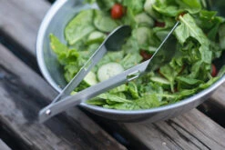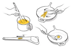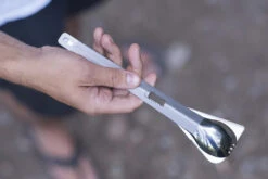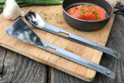 La cuillÚre et la spatule peuvent se regrouper pour former une pince. Une goupille en acier inoxydable sur le haut de la spatule et un trou dans la cuillÚre permettent de former cette pince trÚs rapidement. Le titane est naturellement flexible, la pince a donc une force de préhension parfaite. Pratique pour retourner les aliments sur le barbecue, préparer des bons petits plats au camping et les déguster ensuite.