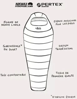 L’Ascent 500 de Rab est un sac de couchage garni avec un duvet de canard européen hydrophobe certifié RDS de 650 cuin. Il contient 500 grammes de duvet pour une température de confort de 1°C. Il est doté d’une fermeture éclair longue à double curseur, avec un rabat anti-froid, ainsi que d’une collerette avec cordon de serrage, d’une poche interne zippée et d’une capuche enveloppante avec un cordon de serrage. Il est disponible en taille standard (taille R) ou long (taille L) pour les personnes mesurant plus de 185 centimètres.