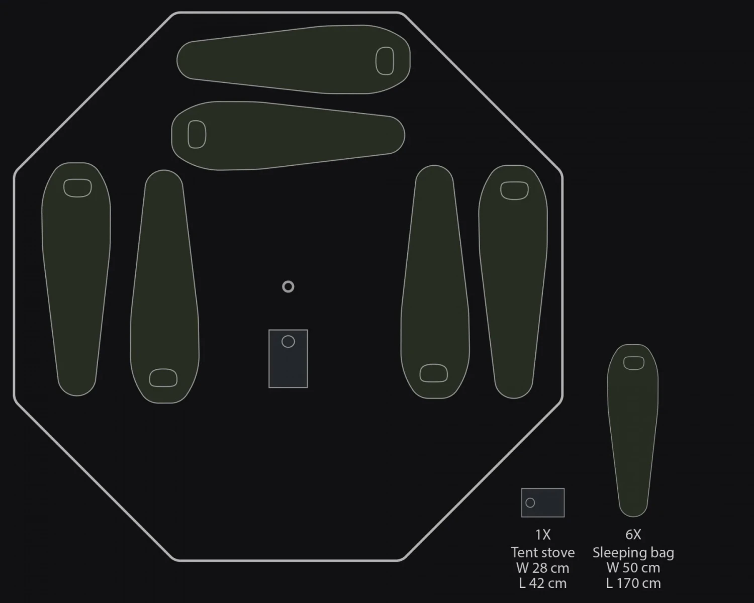 Il s’agit d’un système complet, prêt à l’emploi comprenant : la toile de tente, un mât central, 8 poteaux d’angle et 8 piquets. Le tapis de sol et le poêle à bois montré sur les photos sont vendus séparément.