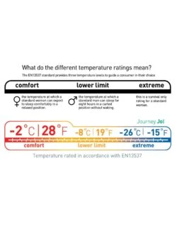 Grâce aux caractéristiques techniques, le Journey JOI offre une température confort de -2°C ce qui est performant au regard du volume et du poids total du sac de couchage.