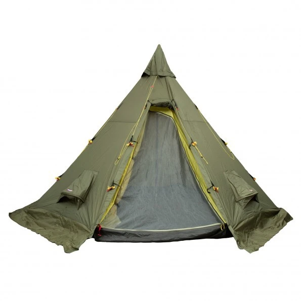 La chambre intérieure est en tissu plein. Une zone en mesh située au niveau du passage du mât évite que les moustiques ne puissent rentrer par le haut du tipi. La grande porte est composée d’un panneau plein et d’un panneau en moustiquaire permettant de ventiler l’abri. Sur le tapis de sol, un renfort pour positionner le mât et éviter d’endommager le polyester.