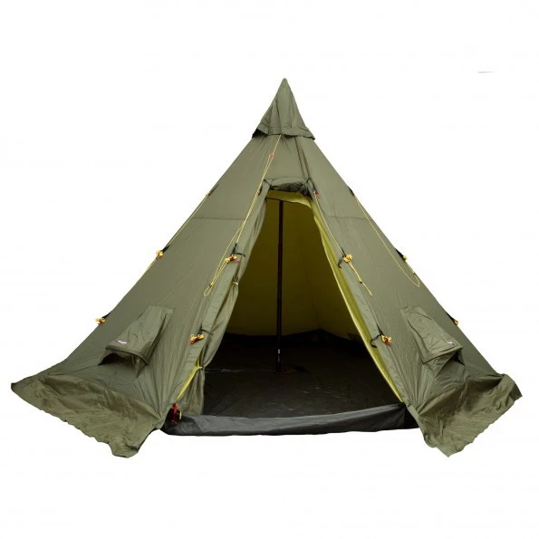 La chambre intérieure est en tissu plein. Une zone en mesh située au niveau du passage du mât évite que les moustiques ne puissent rentrer par le haut du tipi. La grande porte est composée d’un panneau plein et d’un panneau en moustiquaire permettant de ventiler l’abri. Sur le tapis de sol, un renfort pour positionner le mât et éviter d’endommager le polyester.