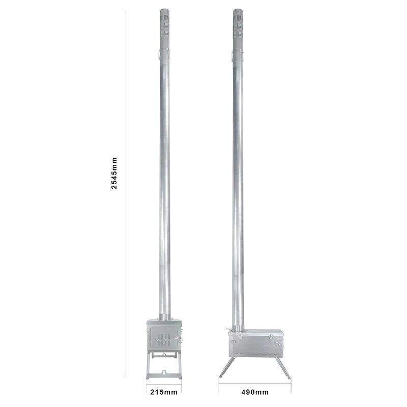 Ses tubes rigides lui assurent une meilleure stabilitĂ© et permet dâatteindre une hauteur totale de 255 centimĂštres Ă la sortie du conduit de cheminĂ©. La partie sommitale est Ă©quipĂ©e dâun pare-Ă©tincelles pour Ă©viter la projection de braise Ă lâextĂ©rieur. Il est conseiller dâhaubaner le conduit (haubans non fournis) au niveau du pare-Ă©tincelles lorsquâil y a du vent. Deux grands piquets en titane de 30 centimĂštres permettent de stabiliser le poĂȘle au sol.